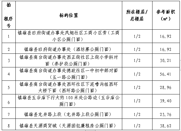 受鎮(zhèn)雄縣物業(yè)管理中心委托:公開拍租鎮(zhèn)雄縣主城區(qū)內8個公廁門面3年期經營權。相關事項如下: