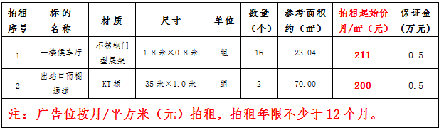 (四)拍租鎮(zhèn)雄縣開元商業(yè)物業(yè)服務(wù)有限公司以勒高鐵站站前廣場(chǎng)各類廣告位使用權(quán),詳見下表: